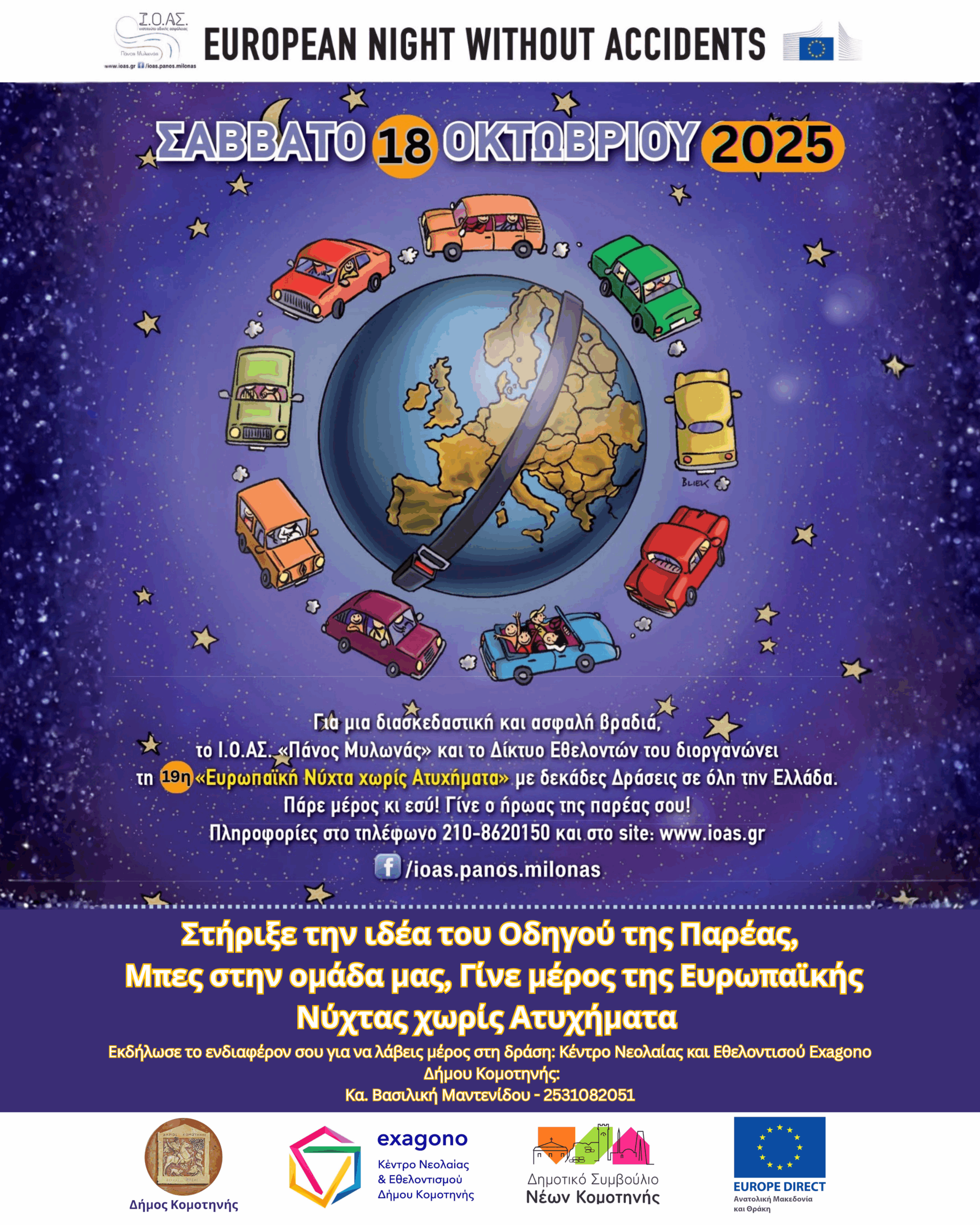 Το Ινστιτούτο Οδικής Ασφάλειας (Ι.Ο.ΑΣ.) «Πάνος Μυλωνάς» διοργανώνει για 19η συνεχή χρονιά τη μεγάλη πανελλαδική δράση ευαισθητοποίησης «Ευρωπαϊκή Νύχτα χωρίς Ατυχήματα», το Σάββατο 18 Οκτωβρίου 2025, σε δεκάδες πόλεις σε όλη την Ελλάδα, με τη συμμετοχή εκατοντάδων εθελοντών του Δικτύου του.