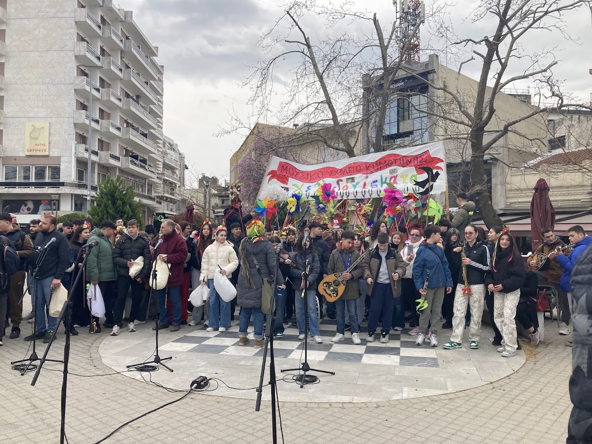 Στην πλατεία ακούστηκαν τα κάλαντα της άνοιξης από τα παιδιά του Μουσικού Σχολείου Κομοτηνής , του Δημοτικού Σχολείου Κοσμίου και του 10ου Δημοτικού Σχολείου δίνοντας μια νότα χαράς και αισιοδοξίας.