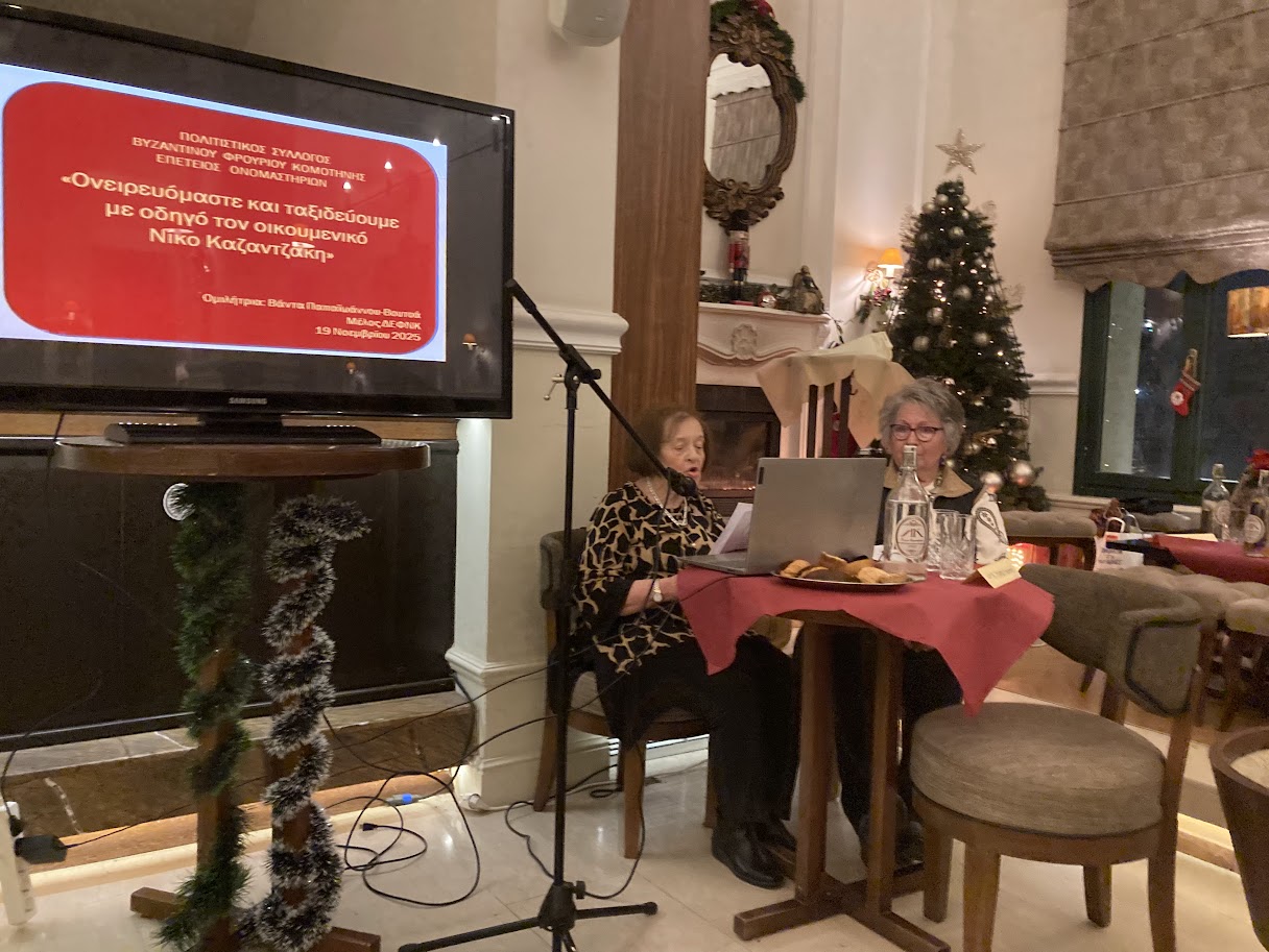 Αυτό ήταν το θέμα της ομιλίας της βραιδάς που αναπτύχθηκε από την Βάντα Παπαϊωάννου-Βουτσά, μέλος της ΔΕΦΝΚ, η οποία παρουσίασε με επιλεγμένα αποσπάσματα από τα έργα του Ν. Καζαντζάκη και αντίστοιχες εικόνες, ένα λογοτεχνικό ταξίδι με πολλούς σταθμούς σε Ευρώπη, Ασία και Αφρική τονίζοντας πως ο «μεγάλος ταξιδευτής των πολιτισμών και των τόπων» με τα βιβλία του.