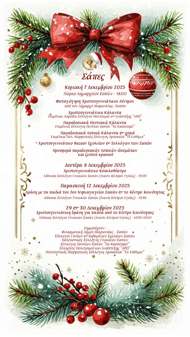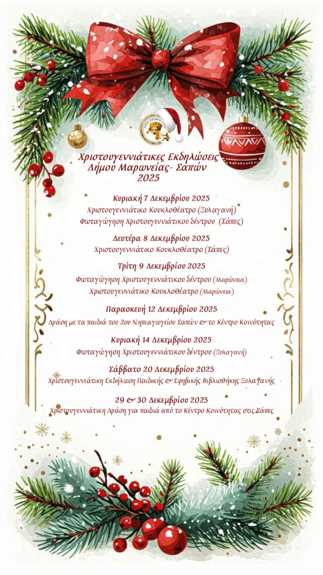 Ο Δήμος Μαρωνείας-Σαπών, με μεγάλη χαρά ανακοινώνει το πρόγραμμα των Χριστουγεννιάτικων εκδηλώσεών του για το 2025, μεταφέροντας μας το πνεύμα των εορτών και τη μαγεία των Χριστουγέννων.